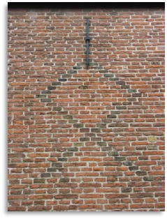 Links boven: aan een andere zijde van de poort zijn maar liefst nog 3 kruisen (niet op rij) bewaard gebleven. Wel van andere baksteen. Deze vaalgele kruisen missen het groen/blauwe glazuur.