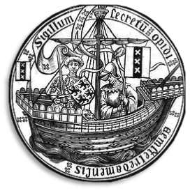 Het stadszegel van Amsterdam van rond 1485 laat een hulk (een vroeg soort koggeschip) zien met aan boord een edelman met het wapen van de graaf van Holland-